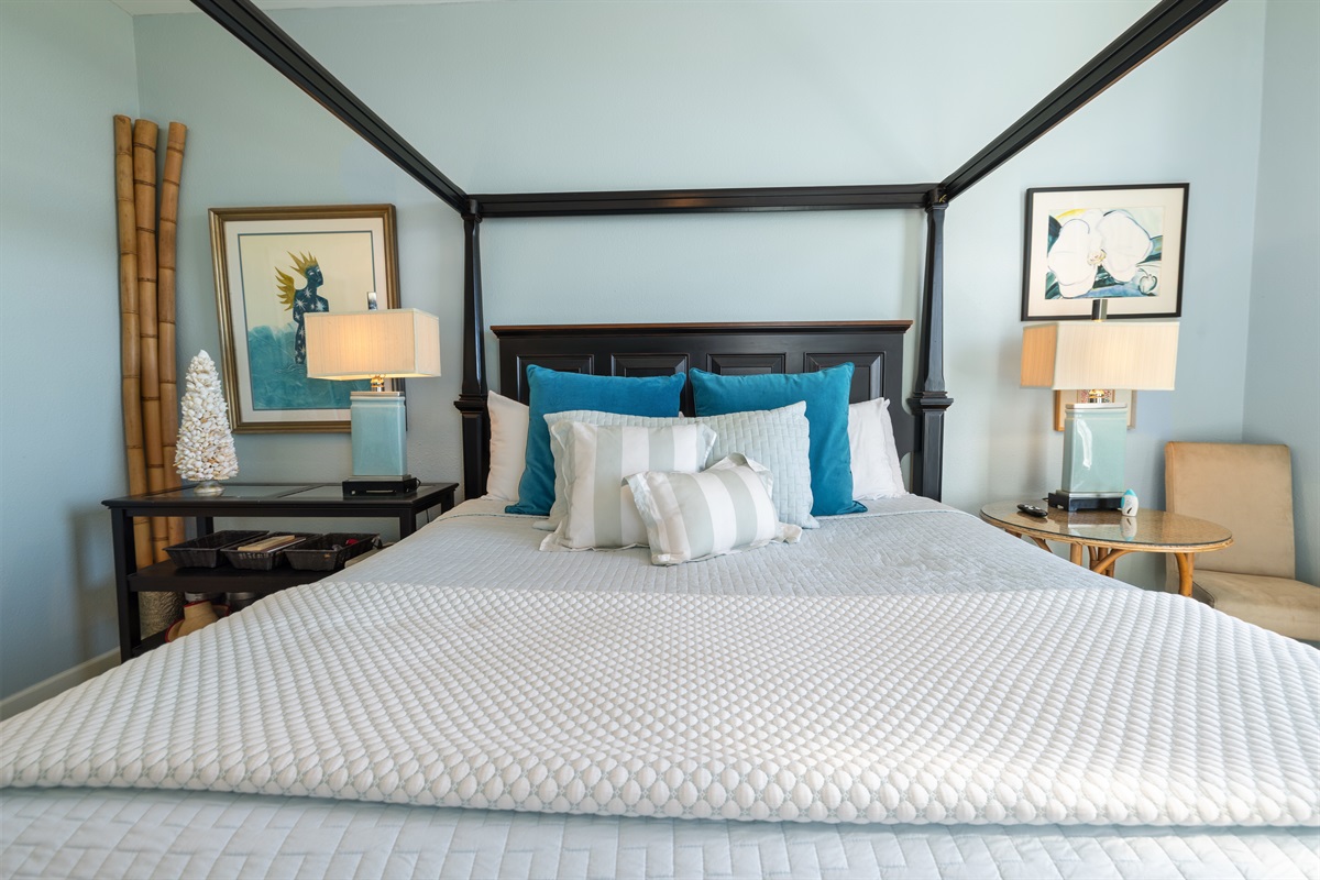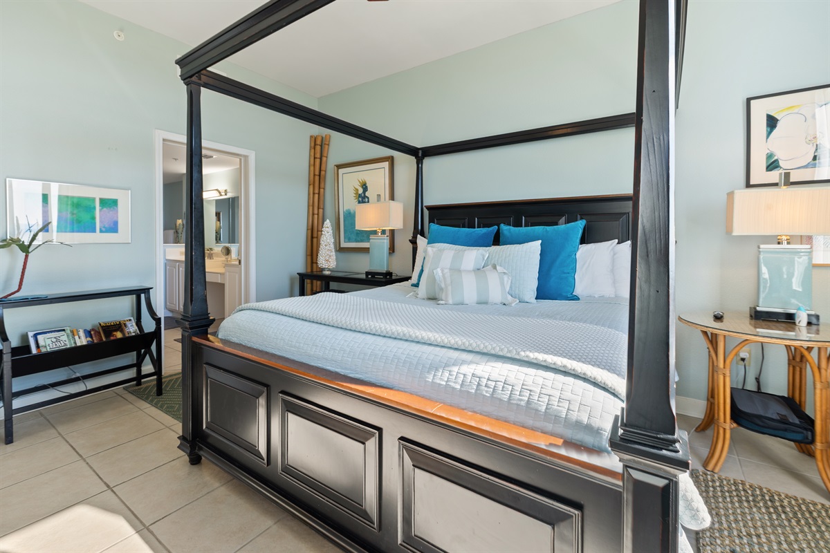 PRIMARY KING SUITE (Sleeps 2): King bed, ensuite bath with walk-in shower and jacuzzi tub.