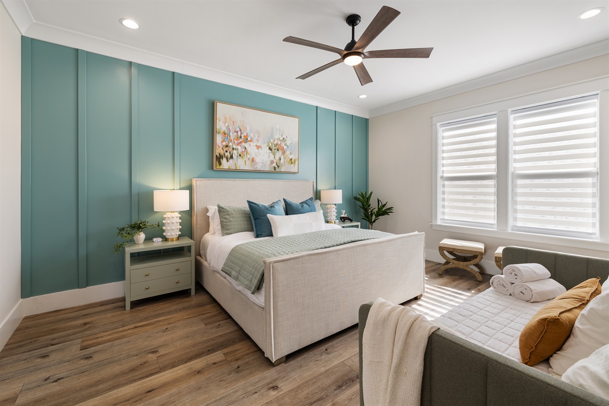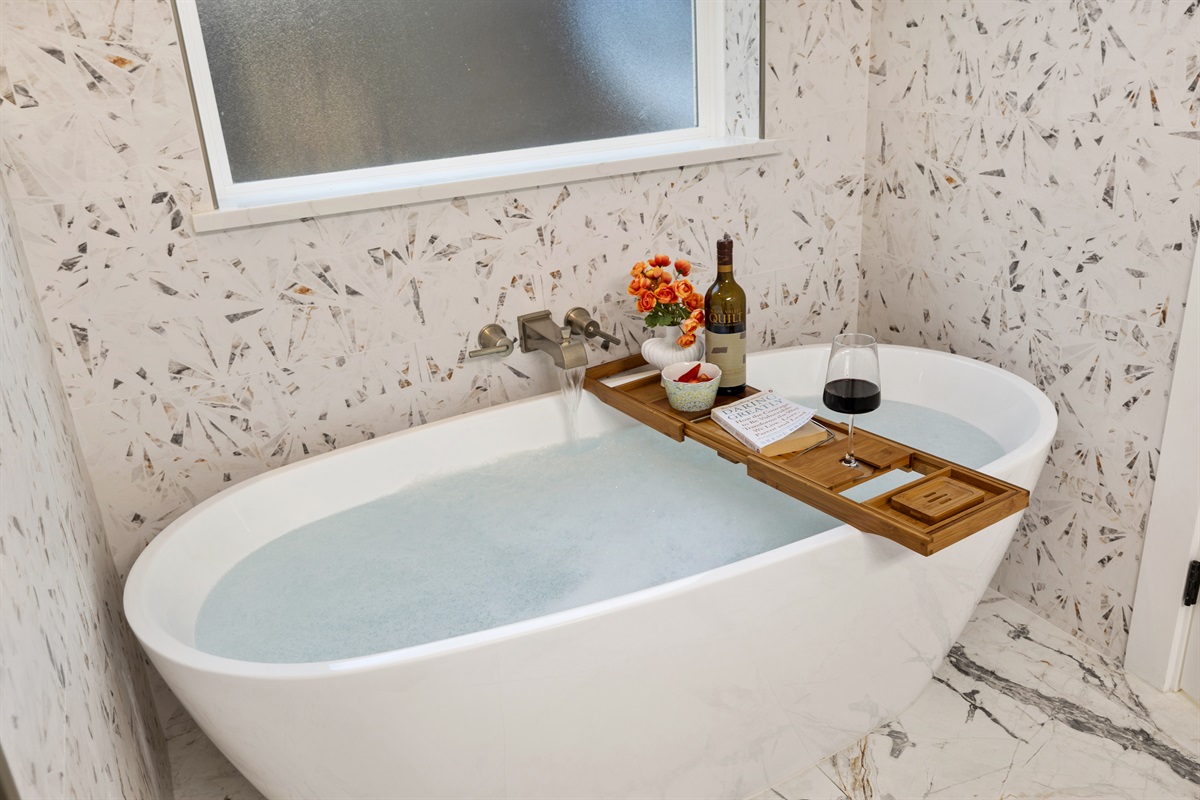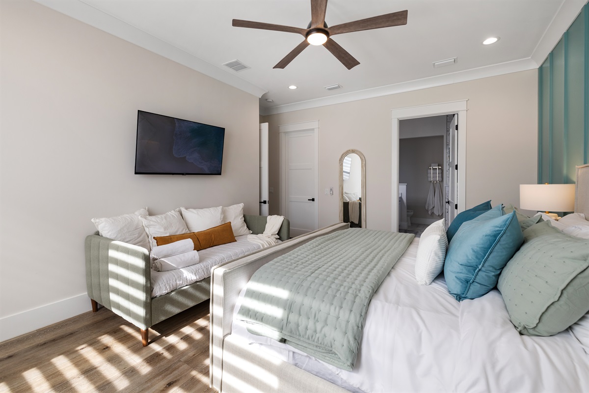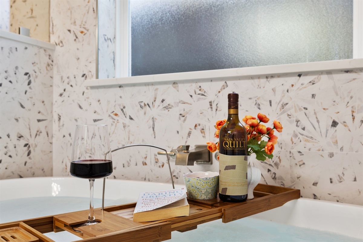 • Primary Suite: King bed + twin daybed (sleeps 3), ensuite bath w/ soaking tub & walk-in shower